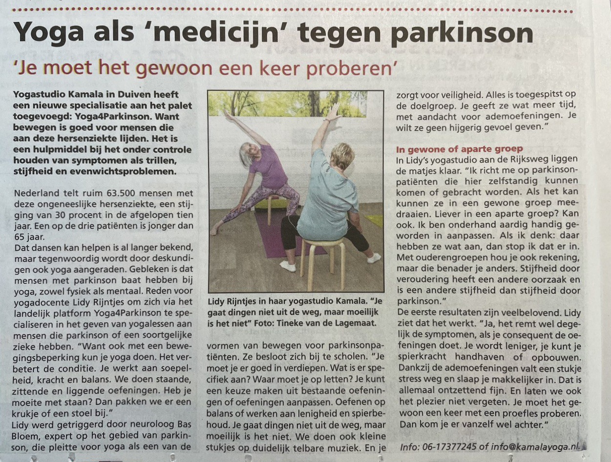 Vandaag in het Duivens Nieuwsblad! Yoga speciaal geschikt voor mensen met Parkinson.